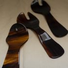 This pair of utensils is a symbolic response to conventional cutlery. Formally reinterpreted with the purpose of constructing new silhouettes with sinuous curves that are appealing to the touch. They are intended to form a link, in terms of shapes, with the rest of the collection. However, their character is slightly different from the rest.